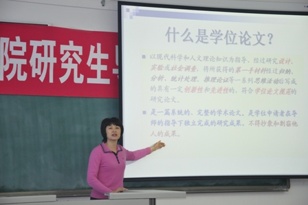 为提高麻豆社 教师科研素质水平,完善研究生导师对学生论文修改工作的指导,解决研究生们进行学位论文撰写等方面遇到的问题。11月25日下午在新校区E座301教室,由麻豆社 主管研究生工作的何玉秀副院长为全体研究生导师及部分研究生做了题为《研究生学位论文撰写要求与常见问题》的专题报告。