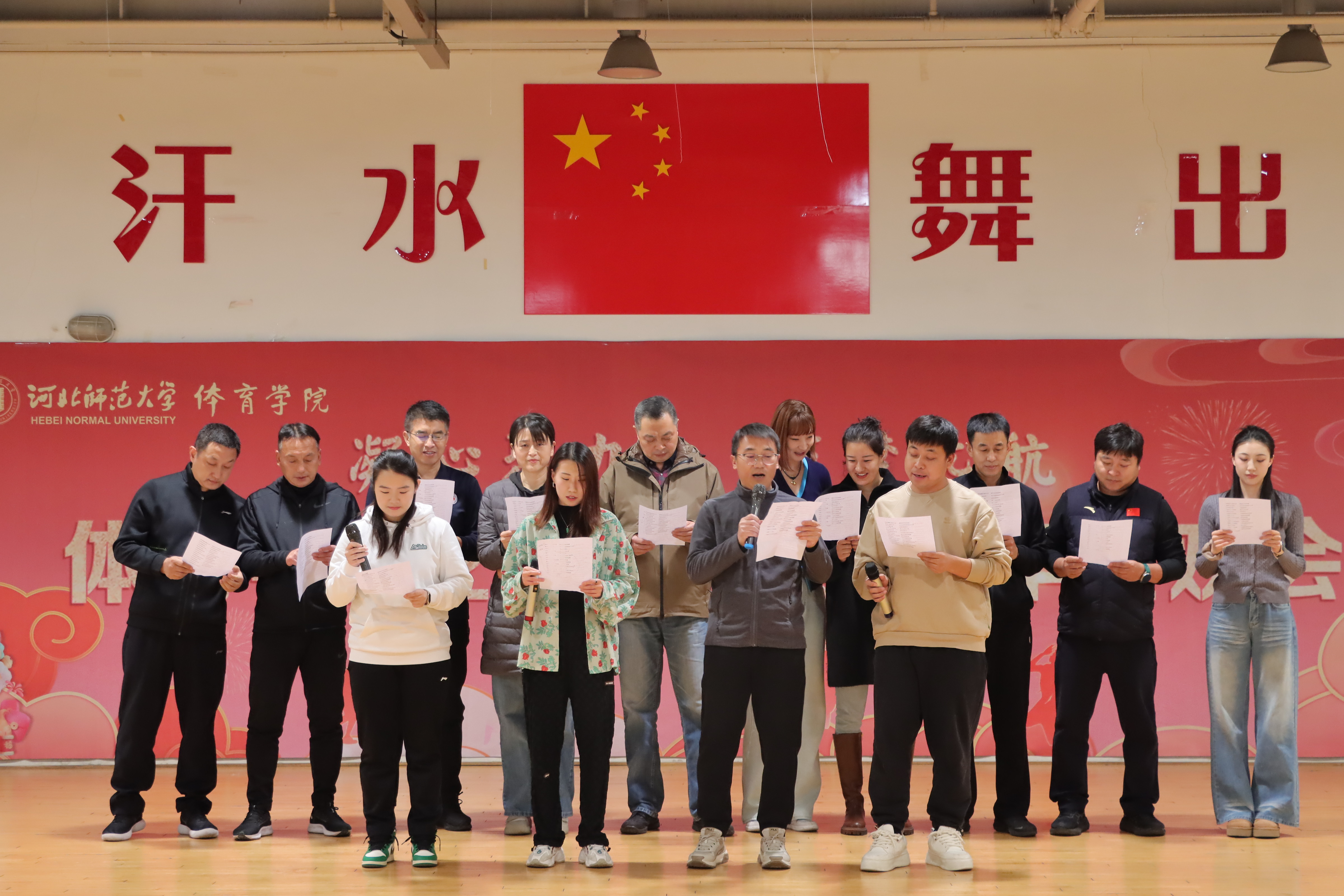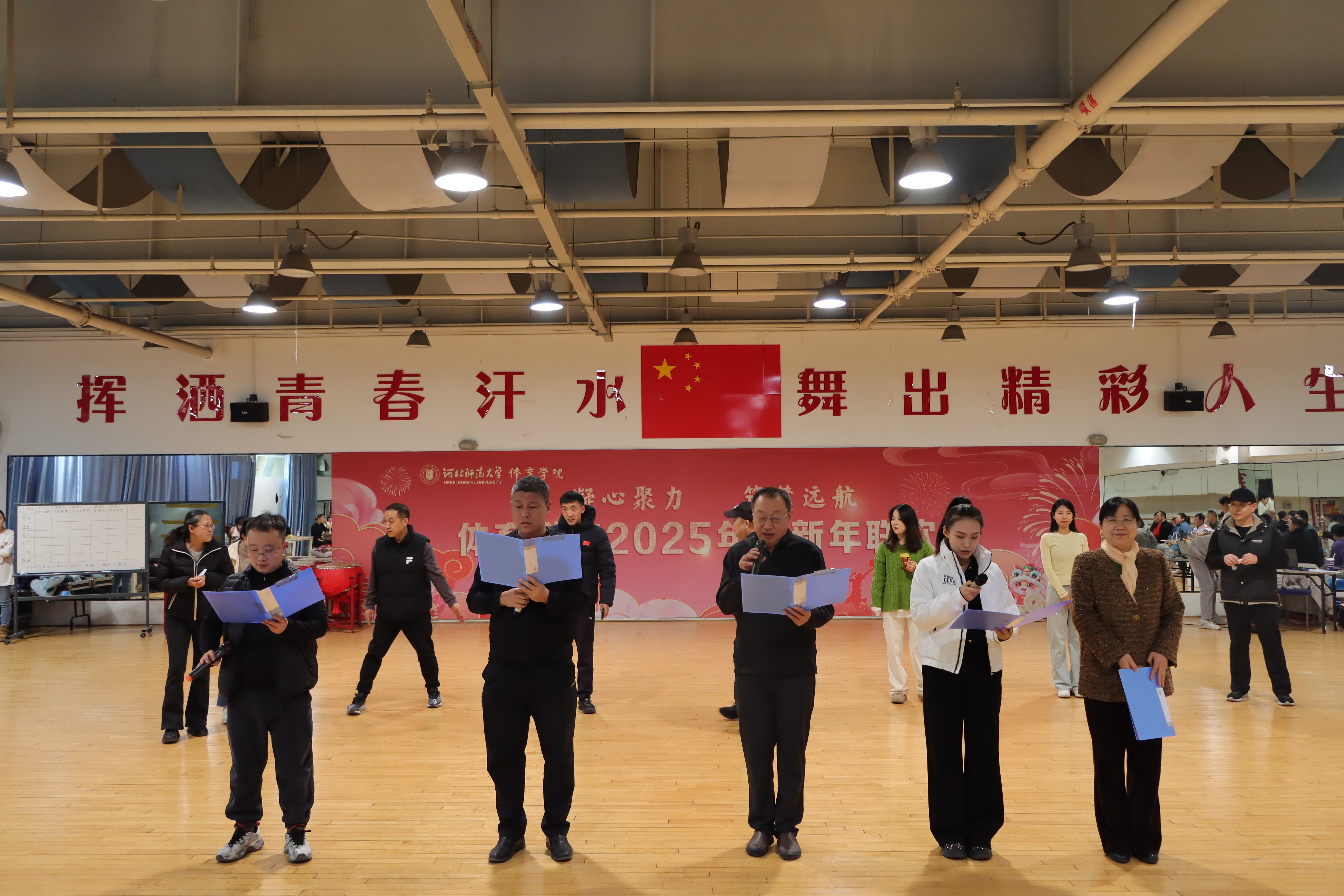 联欢过程中,学院领导班子走上舞台,向全体教职工致以节日的问候与美好的祝愿。院长马剑在致辞中细述了学院在教学、科研、竞赛等方面取得的显著成绩,这些离不开每一位教职工的辛勤付出与无私奉献;书记张晖在送上新年祝福的同时,也对新的一年寄语期望,希望大家继续秉持体育人的拼搏精神,凝心聚力、携手共进,为学院高质量发展贡献更多力量。随后,领导班子与教职工共同参与游戏、表演节目,现场氛围温馨融洽,展现了团队的凝聚力。